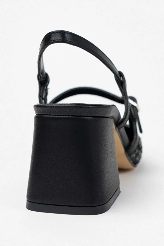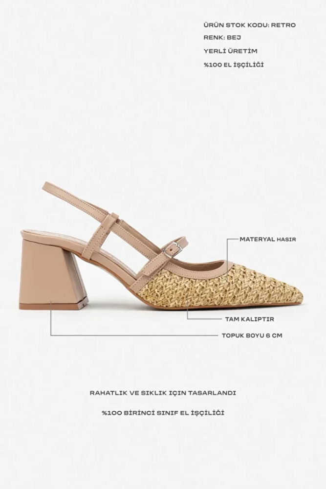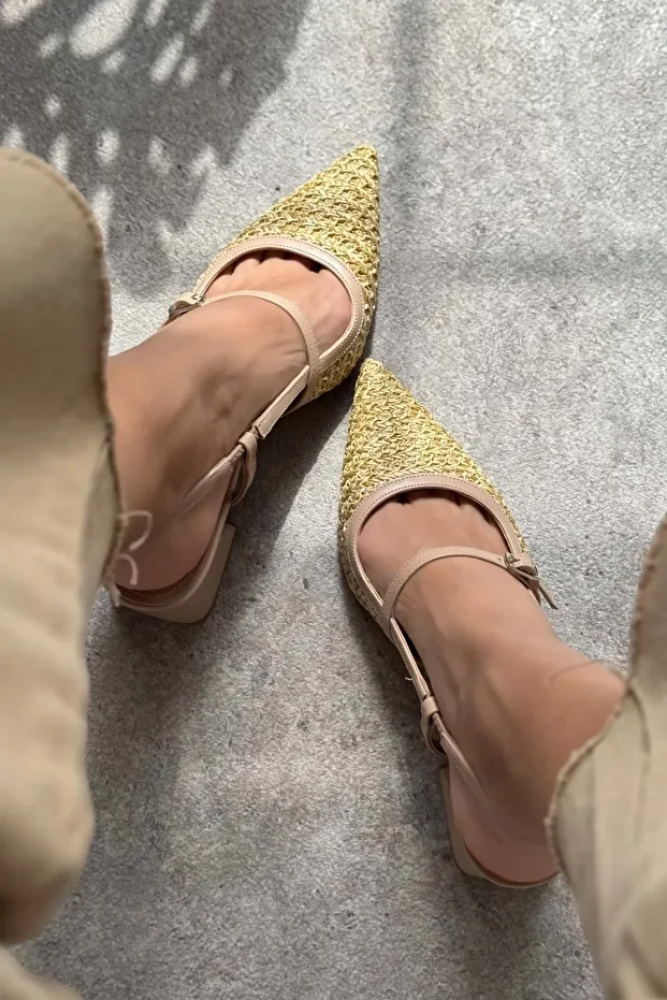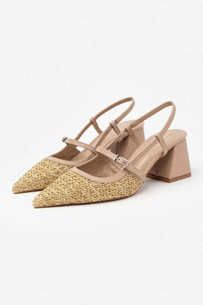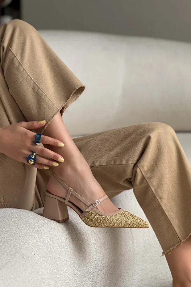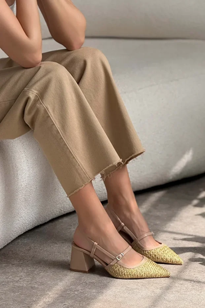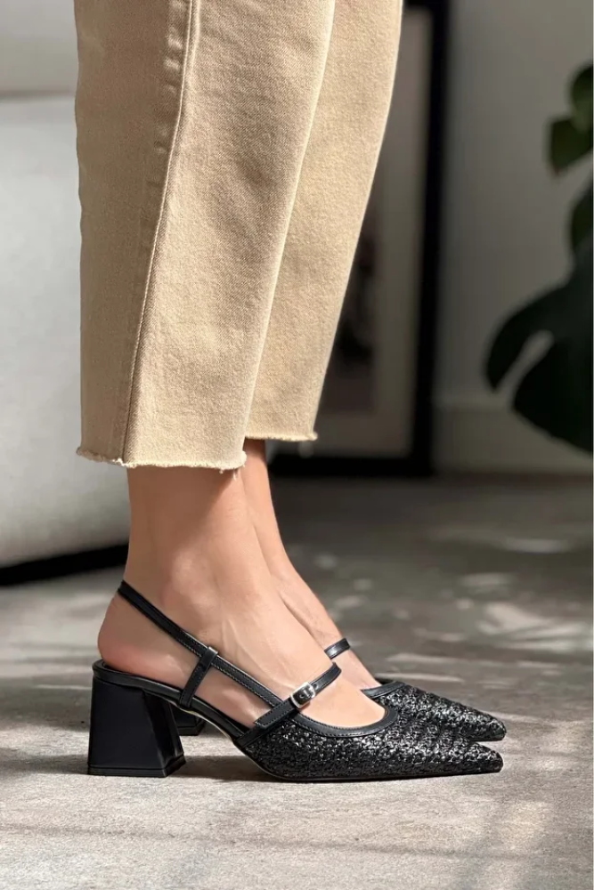 احذية بنات كعب عالي بتصميم كلاسيكي أنيق، مقدمة مدببة، وحزام من القش باللون الأسود يضيف لمسة فريدة تناسب جميع المناسبات.